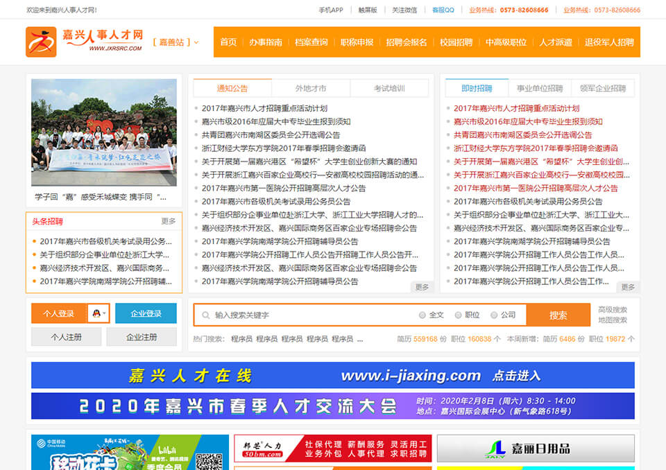 嘉興人才網(wǎng)( www.573job.com ),為用人單位和個(gè)人提供便捷、高效的互動(dòng)平臺(tái),現(xiàn)如今網(wǎng)站日均訪問量15萬次,擁有會(huì)員企業(yè)1萬余家,在招職位5萬余個(gè),為人才和企業(yè)提供更優(yōu)質(zhì)的互動(dòng)平臺(tái)!